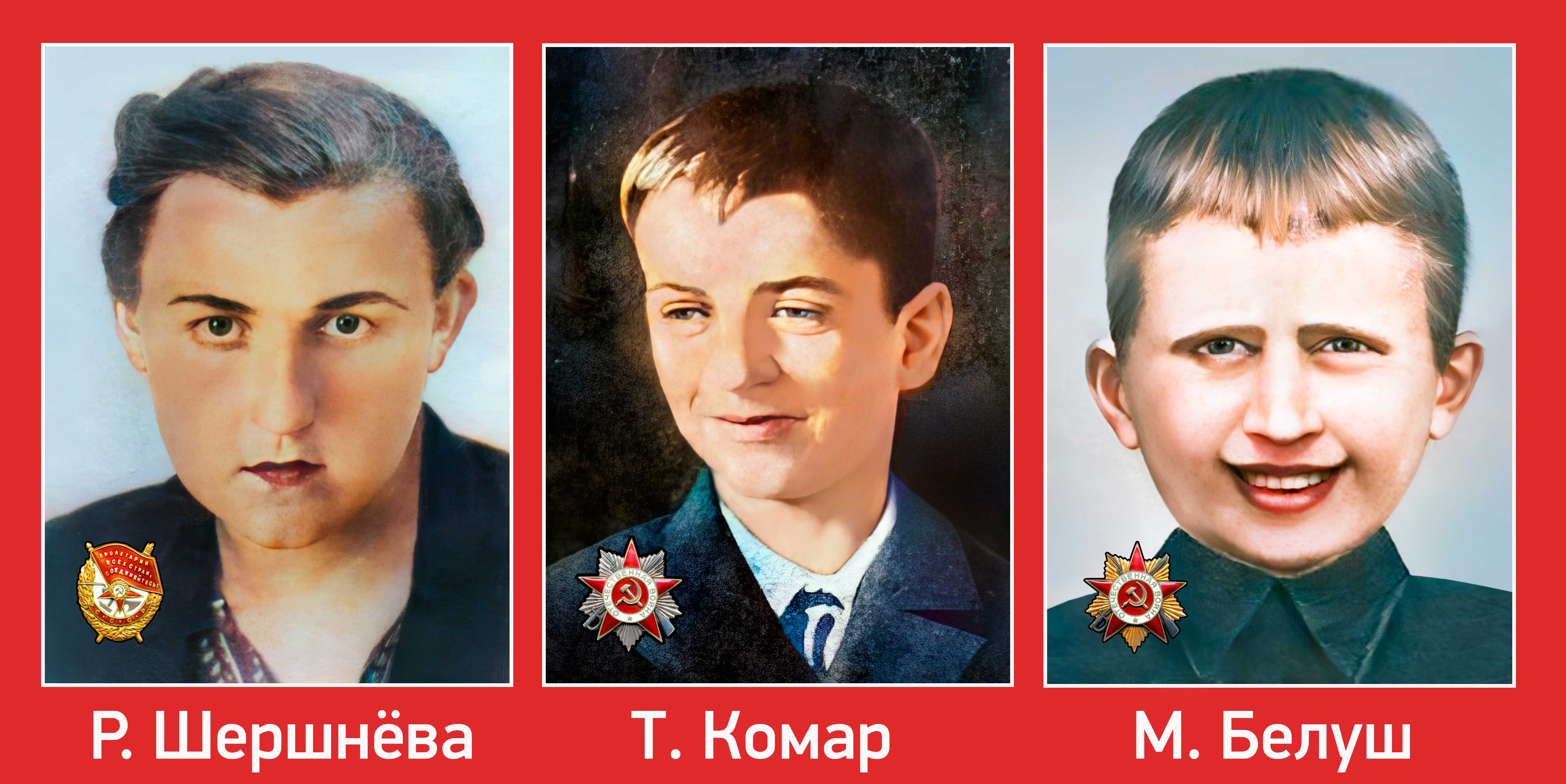Tolya Komar was a Russian by nationality. He performed his heroic feat the day before his 15th birthday. On November 23, 1943, he was in a group of scouts returning from a mission when they came under fire from an emplaced German machine gun. Tolya threw a grenade at it, but when the soldiers got up, the MG resumed firing. Then the young hero blocked it with his body. It was only on April 6, 1985, just before the 40th anniversary of Victory Day, that Anatoly (Tolya) G. Komar was posthumously decorated with the Order of the Patriotic War, 2nd class. Misha Belush was a aBelarusian by nationality. Aged 16, he joined the partisans in May 1943 and took part in derailing eight German trains. He performed his heroic feat on June 16, 1944, on the outskirts of Kupisk village (Novogrudok Region, Western Byelorussia). He disabled one embrasure of an MG emplacement with a bunch of grenades and blocked the second one with his body. Young Mikhail (Misha) A. Belush was posthumously decorated with the Order of the Patriotic War, 1st class.