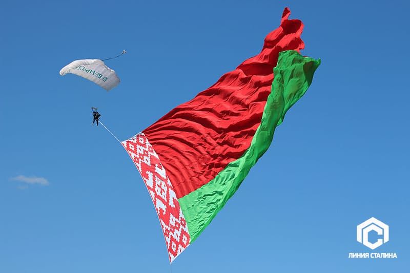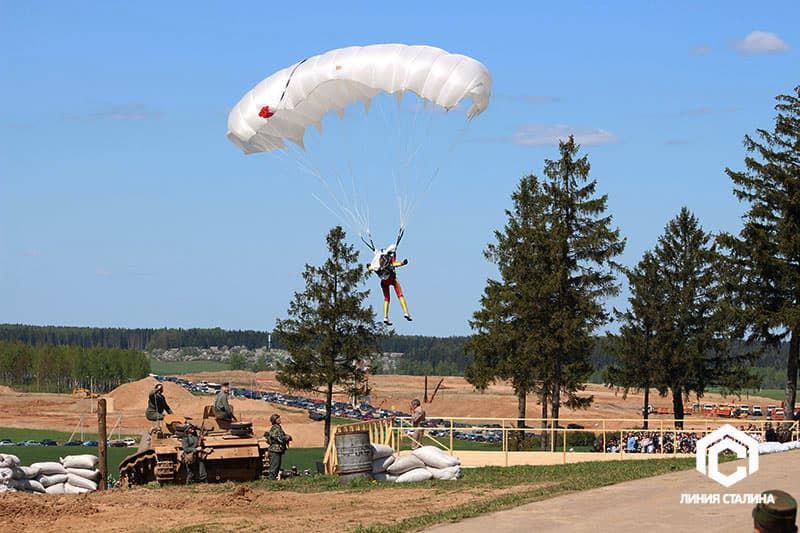 Перед самым началом реконструкции показали своё мастерство парашютисты. Сначала зрителей впечатлило приземление огромного государственного флага нашей республики.
