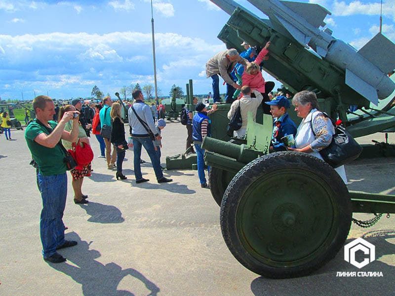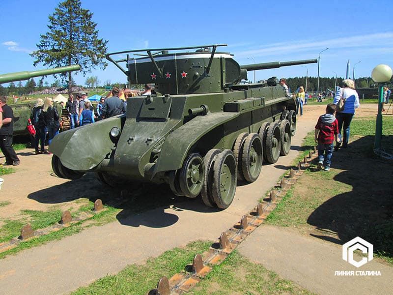 Представление закончилось, и зрители отправляются на площадку ходовой техники. Там отдыхает после парада колёсно-гусеничный танк БТ-7. На параде он демонстрировал свою уникальную возможность двигаться на колёсном ходу!