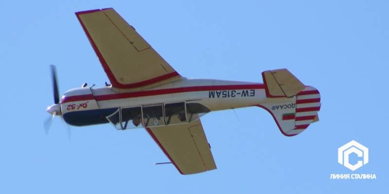 Вслед за парашютистами, началось выступление самолёта Як-52, показавшего фигуры высшего пилотажа.