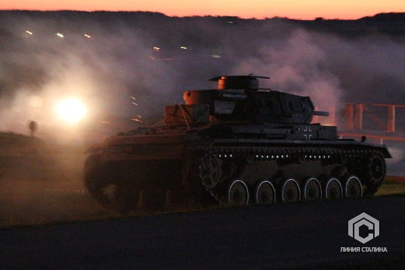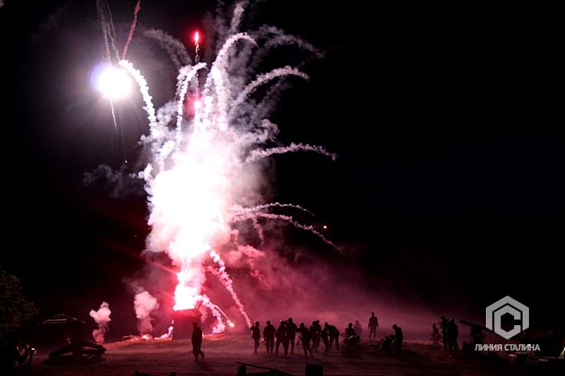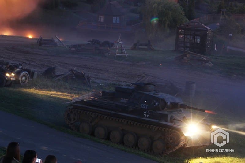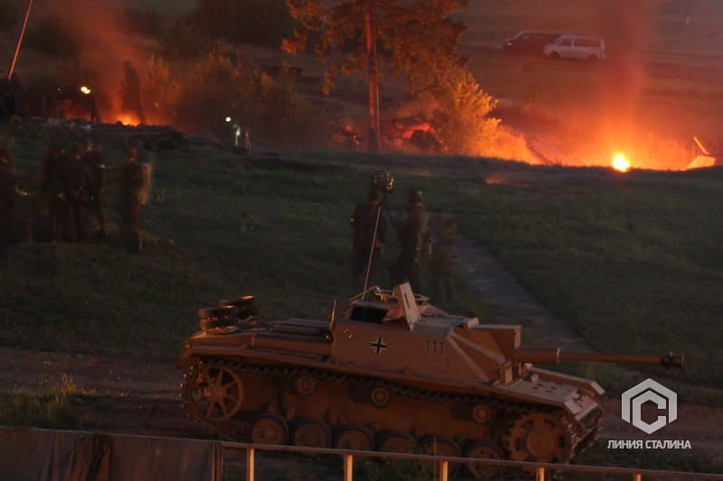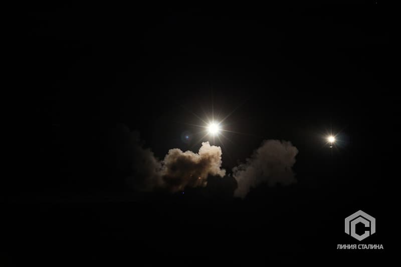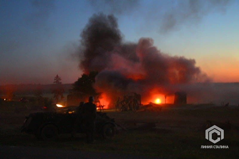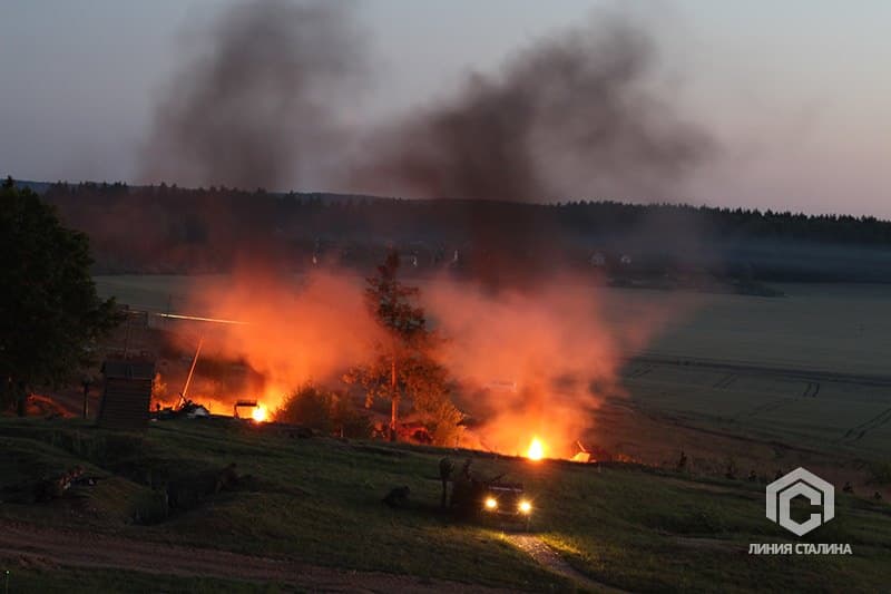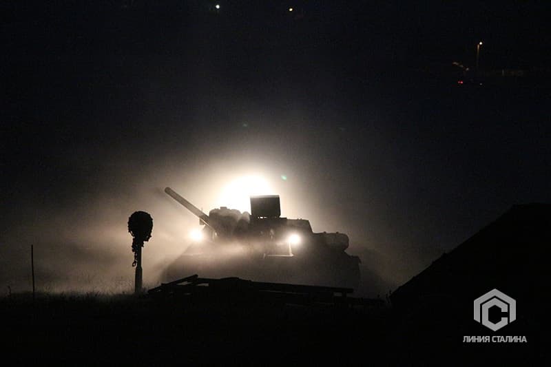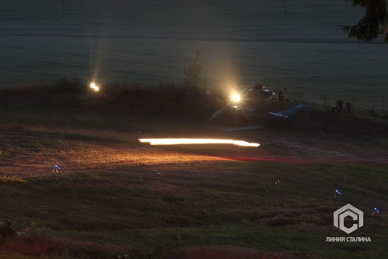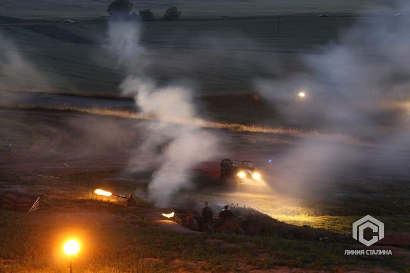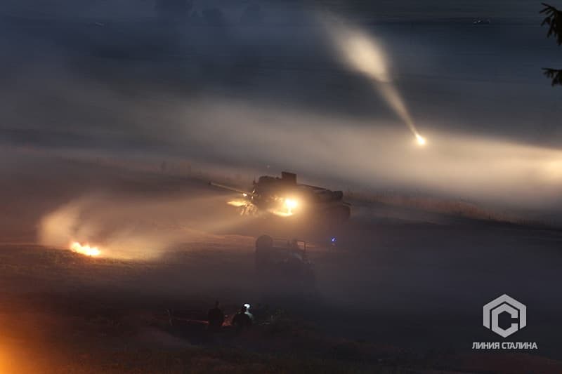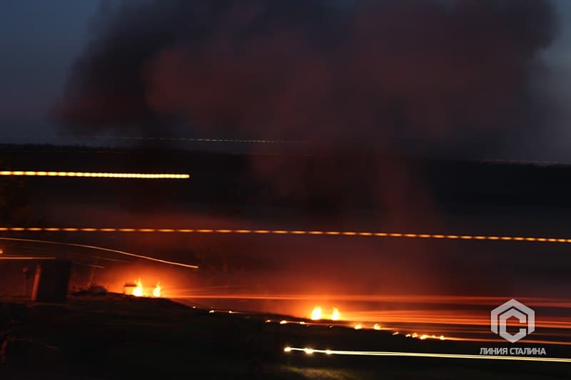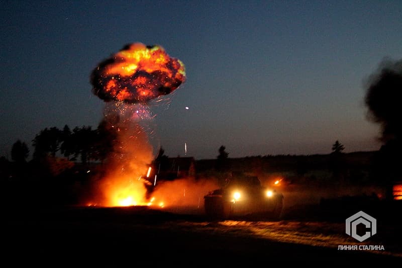 В гуще ночных сумерек разыгрался бой, освящаемый прожекторами, горящими кострами, огнём выстрелов и взрывов, а так же фарами боевых машин.