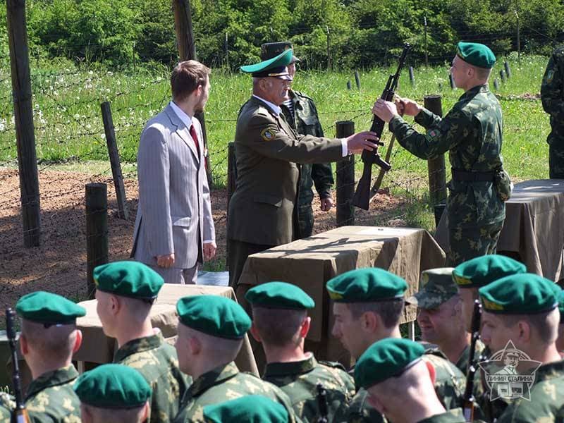 После вручения оружия перед новыми защитниками рубежей нашей Родины выступил командир части полковник А.А.Рум, представитель Дзержинской городской организации ОО «Белорусский союз ветеранов пограничной службы» полковник запаса Ф.М.Барцевич, секретарь Дзержинского районного комитета ОО «БРСМ» К.И.Шик. С духовным напутствием к новому пополнению обратился настоятель храма Покрова Пресвятой Богородицы города Дзержинска отец Павел.