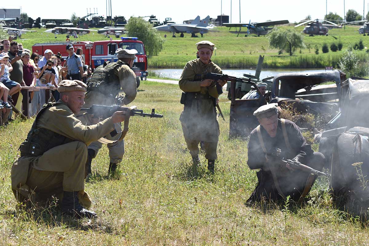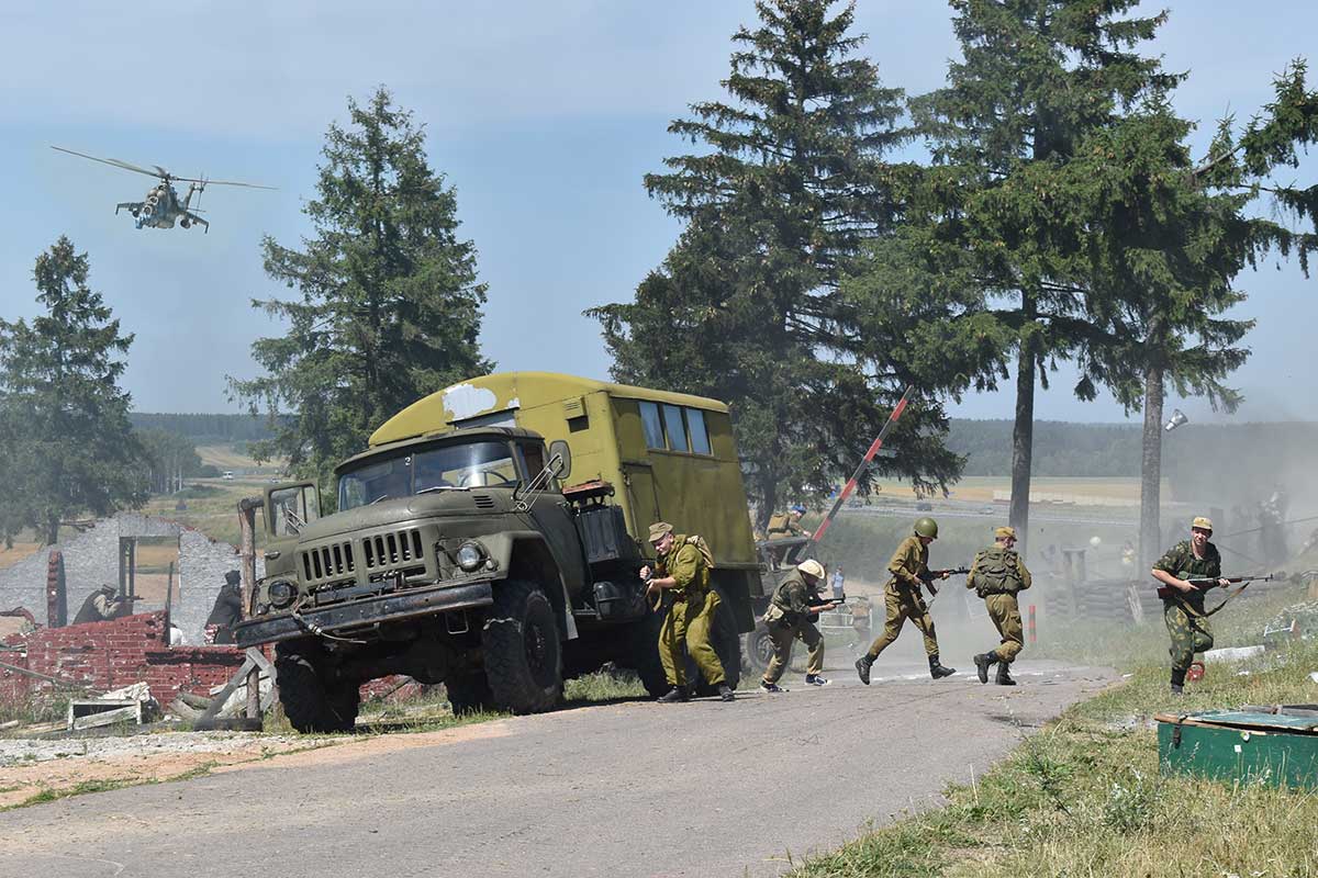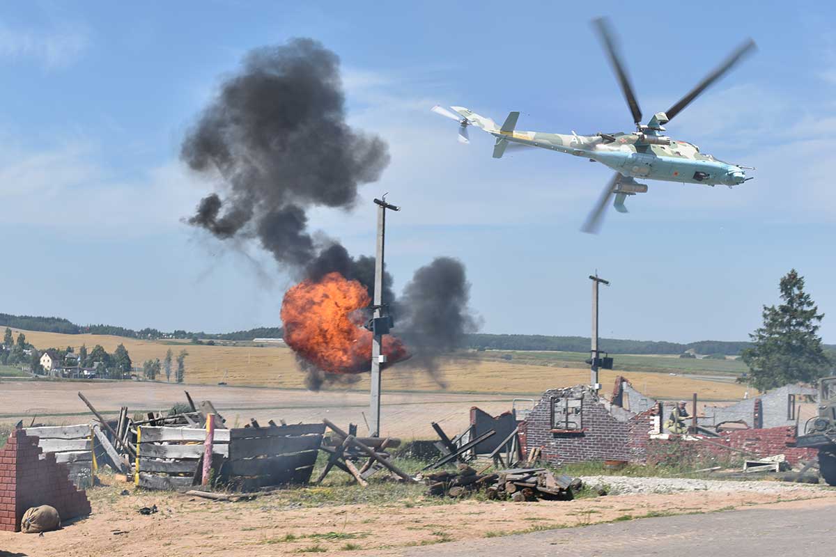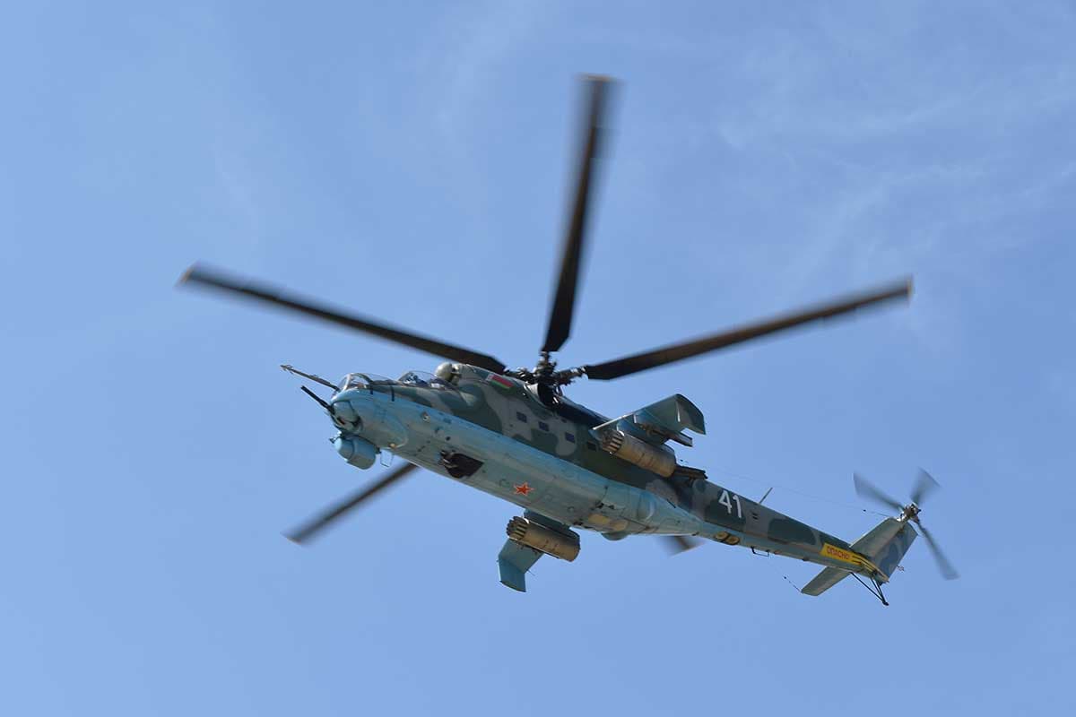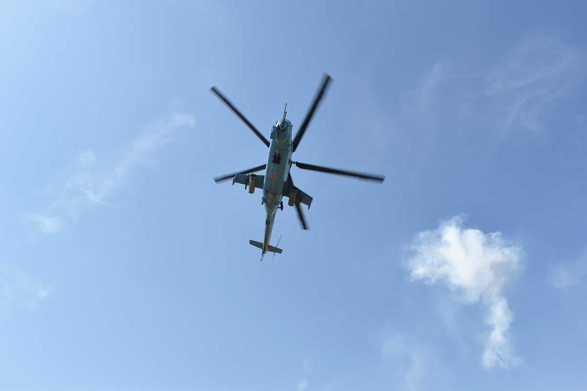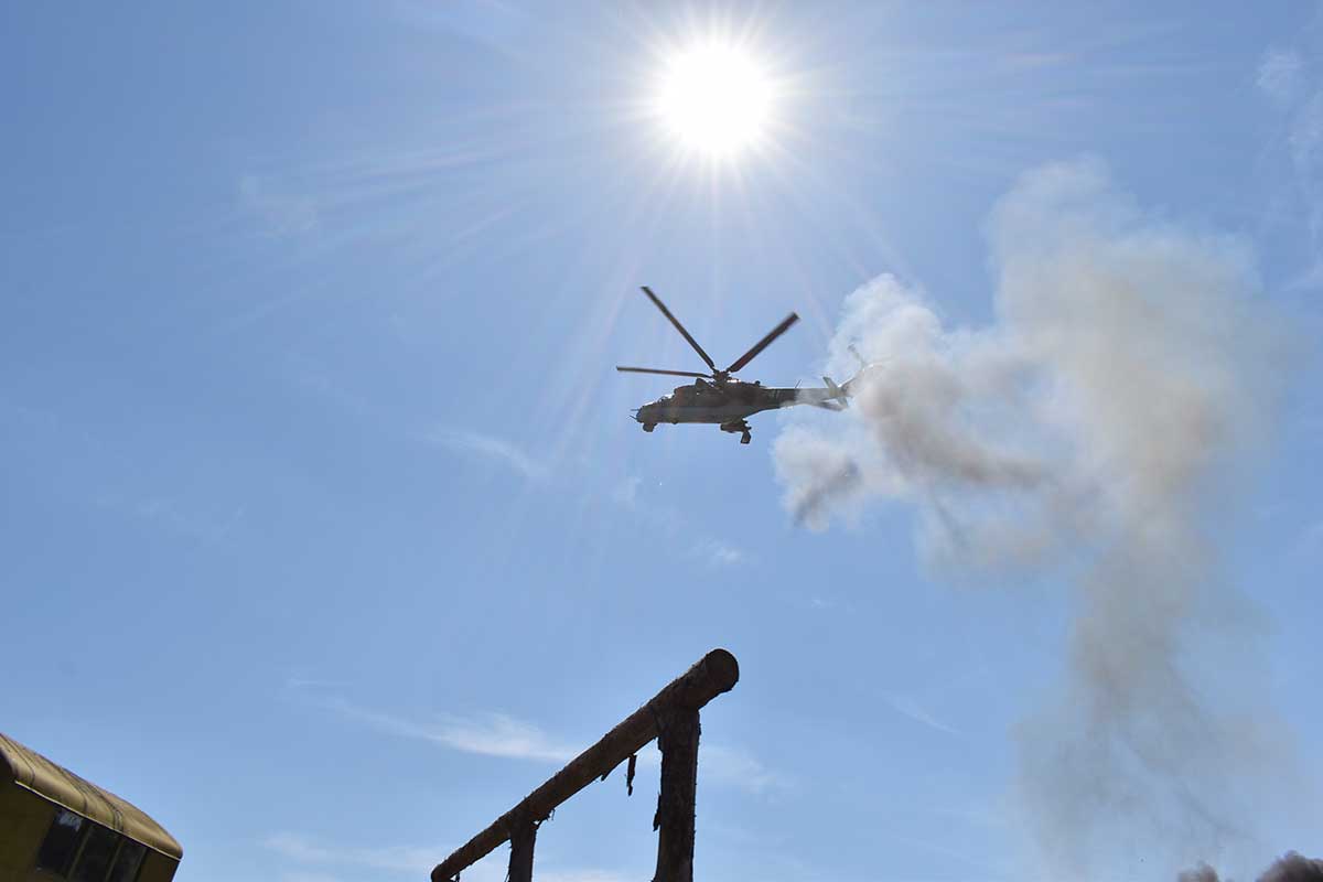 В 14:30 началась реконструкция боя Афганской войны, в которой приняли участие боевые вертолёты Ми-24.