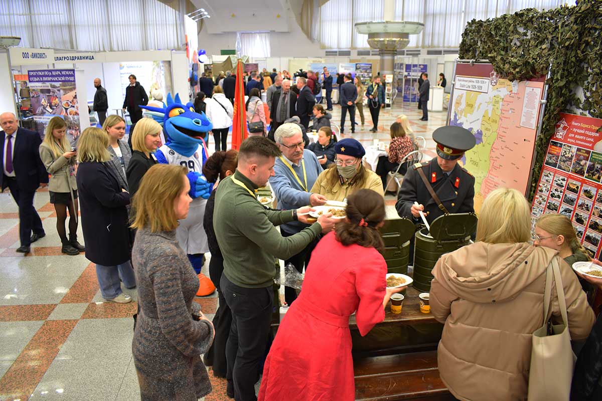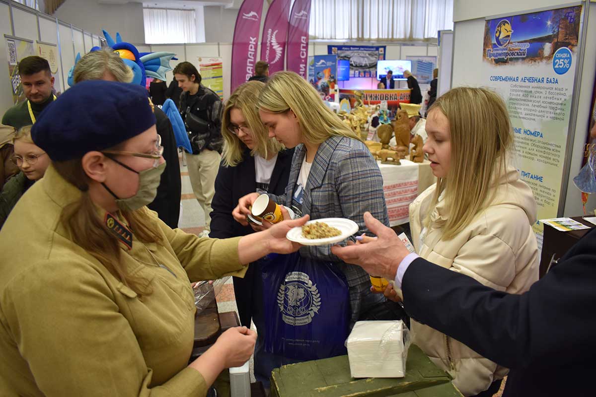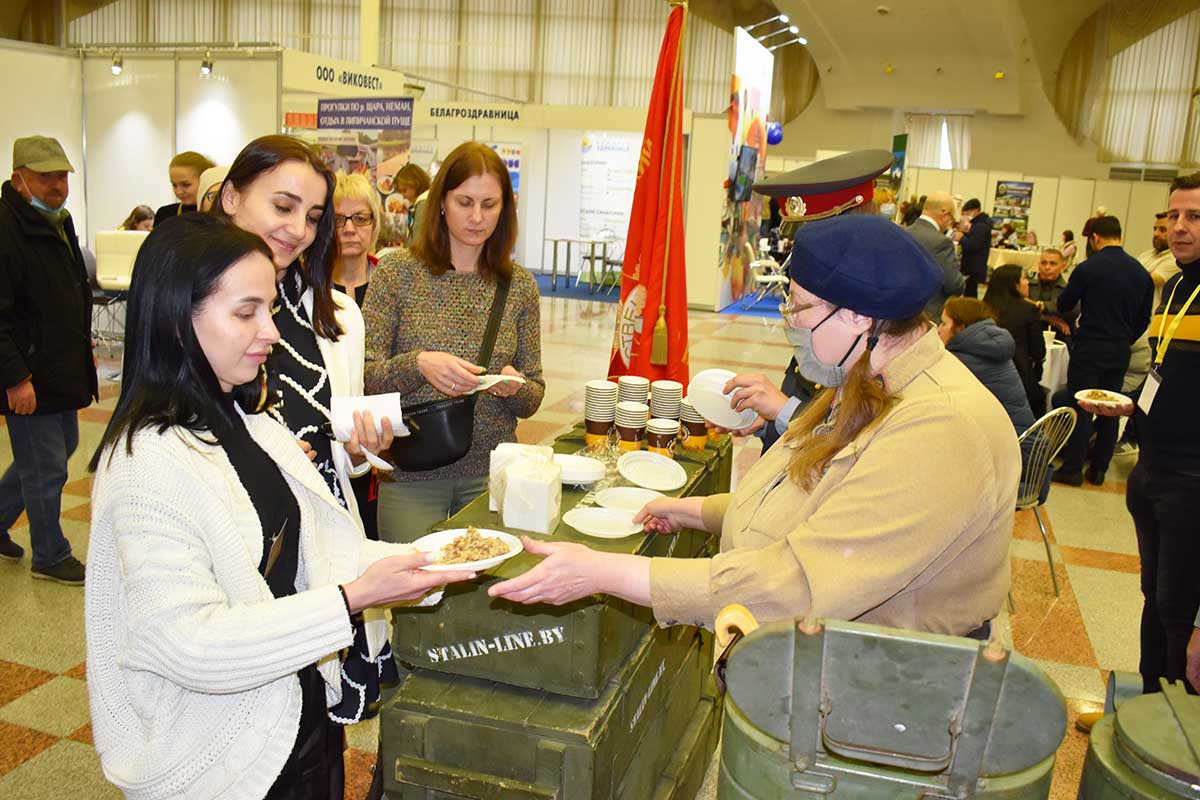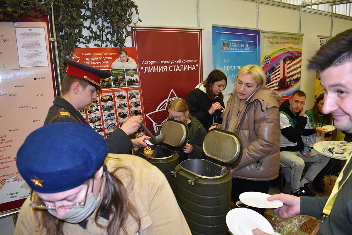 В обед гости могли бесплатно отведать настоящей солдатской каши и чая.