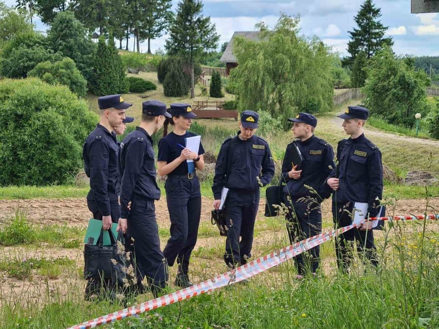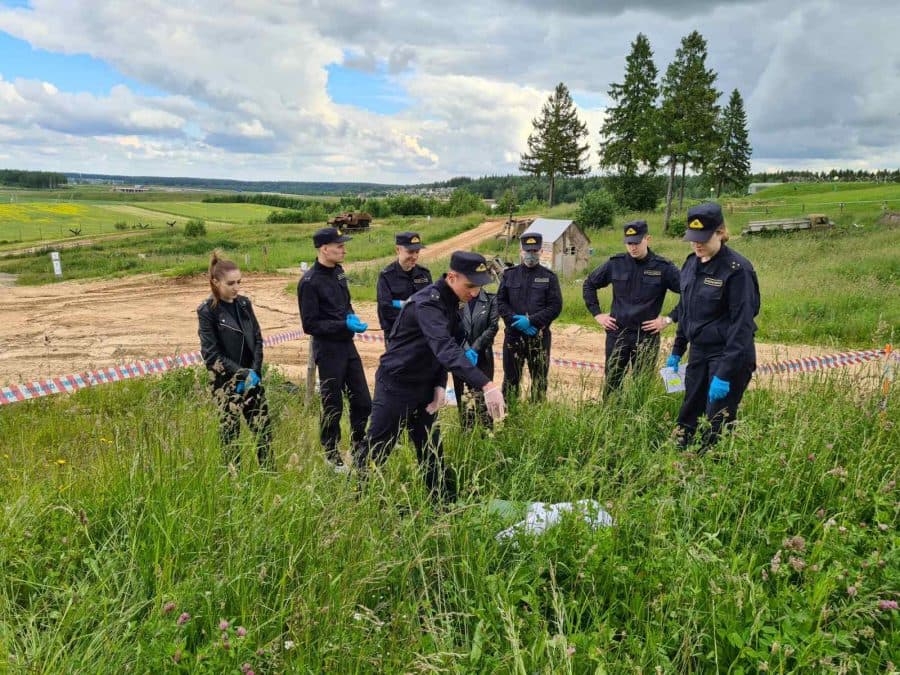 Далее — практическая часть. Первым заданием стал осмотр места происшествия. Согласно вводной, в милицию поступила информация от сотрудника охраны историко-культурного комплекса «Линия Сталина», что возле музея дерутся три человека. Прибывшими в качестве первого наряда сотрудниками органов внутренних дел обнаружены следы распития спиртных напитков и борьбы, пятна бурого цвета на земле, а также следы волочения. Все участники, разделившись на семь команд, отлично справились с предложенным заданием.