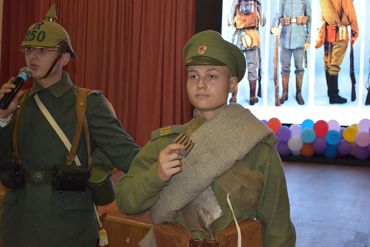 Затем Павел провёл викторину и рассказал о военном обмундировании солдат германской и русской армий. Помогал ему реконструктор рядового Русской Императорской армии Андрей Рощеня. Сам Павел был в форме рядового резервного 250-го полка Германской армии, воевавшего в районе озера Нарочь.