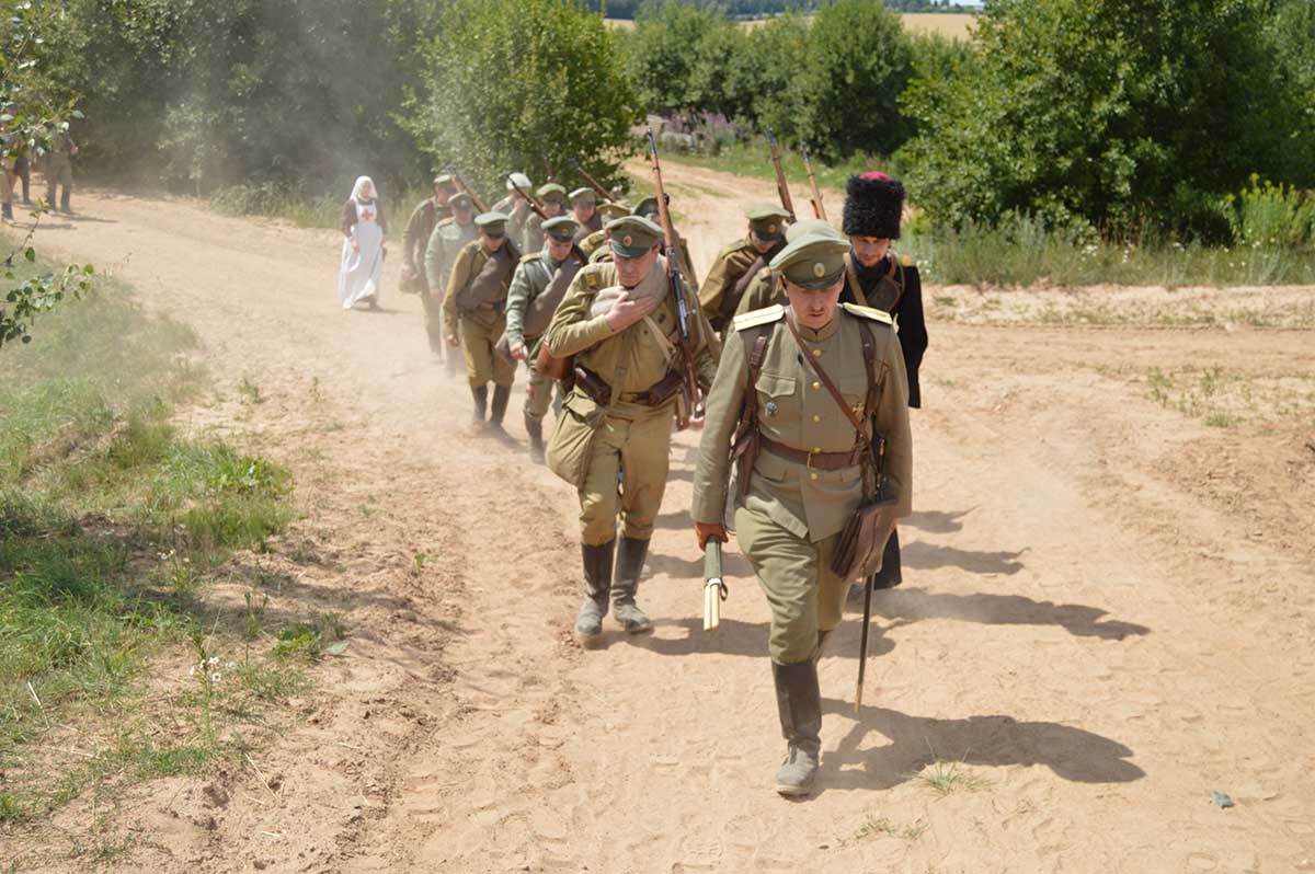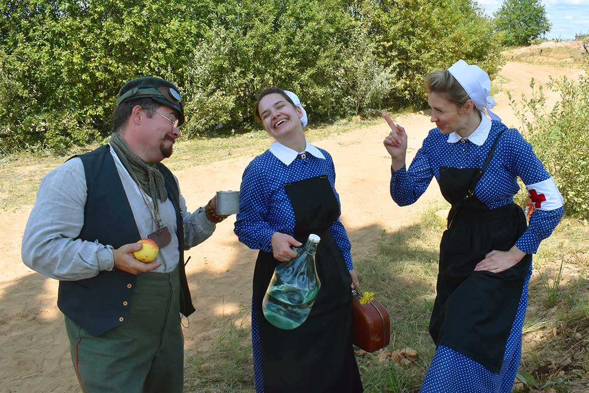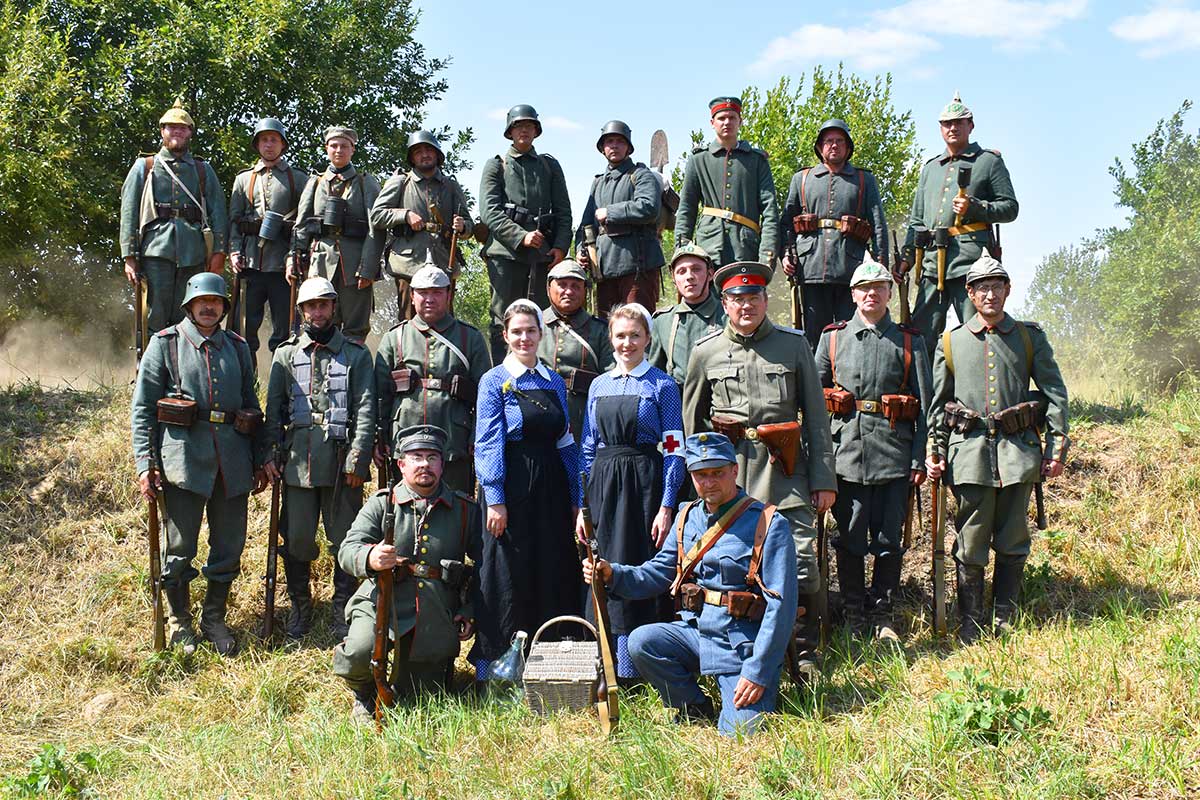 В ней приняли участие реконструкторы Русской Императорской армии, кайзеровской Германии, бравый солдат Швейк из армии Австро-Венгерской империи, дамы и группа гражданского населения.