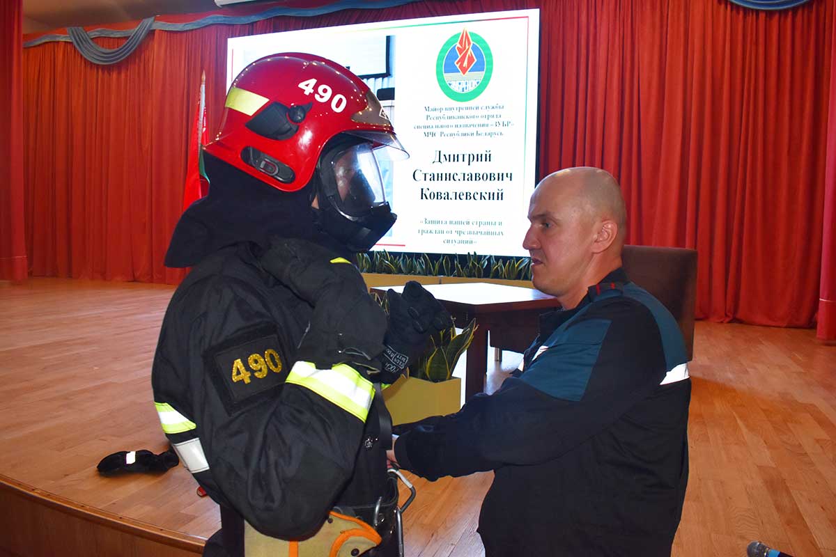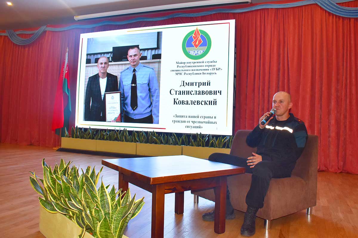 Кроме этого Дмитрий Ковалевский рассказал о своей службе в Республиканском отряде специального назначения «Зубр» МЧС Республики Беларусь, о командировках в Сирию и Турцию, о своём личном участии в извлечении людей из под завалов после землетрясений. На его выступлении детьми было задано наибольшее количество вопросов.