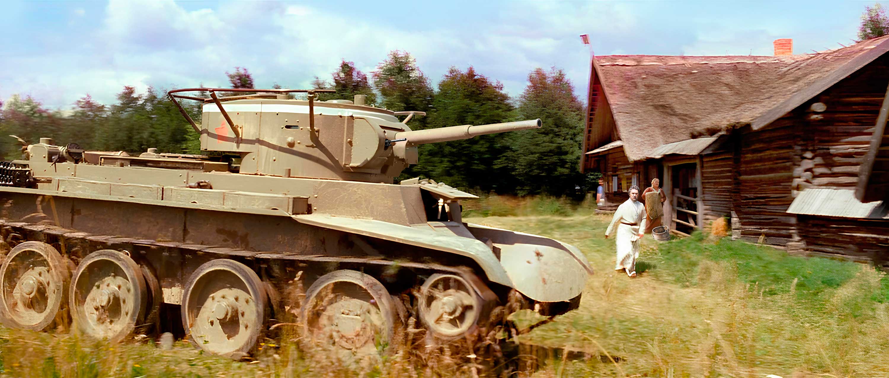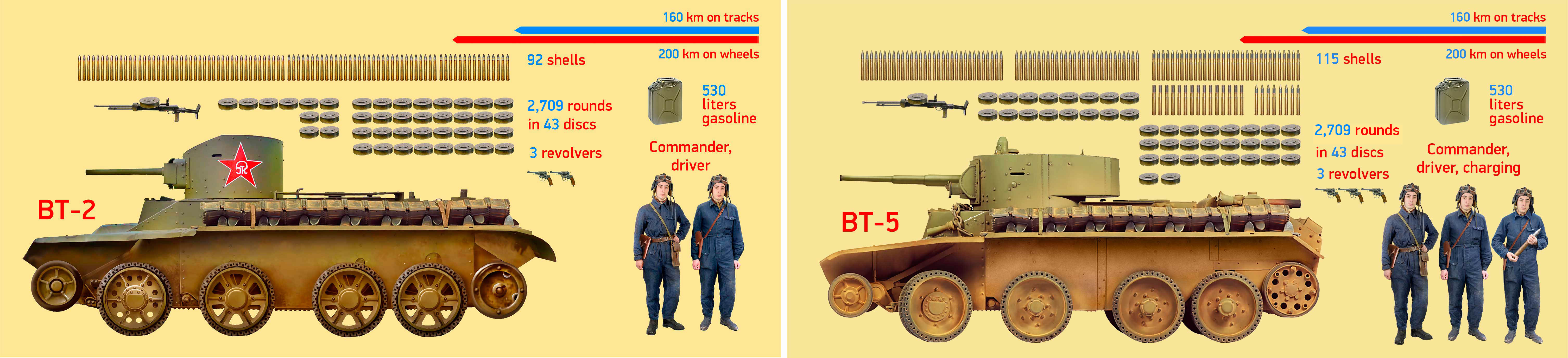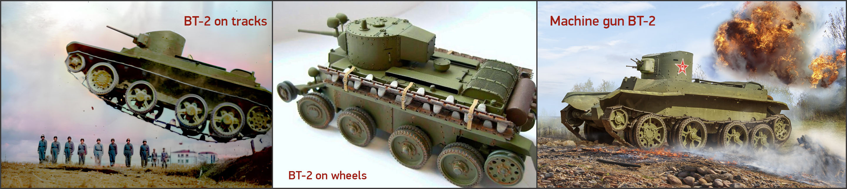 The Soviet version of the Christie tank was named BT – fast tank (fast in Russian «Bystro»). On wheels it reached a speed of 72 km/h, on tracks – 52 km/h.