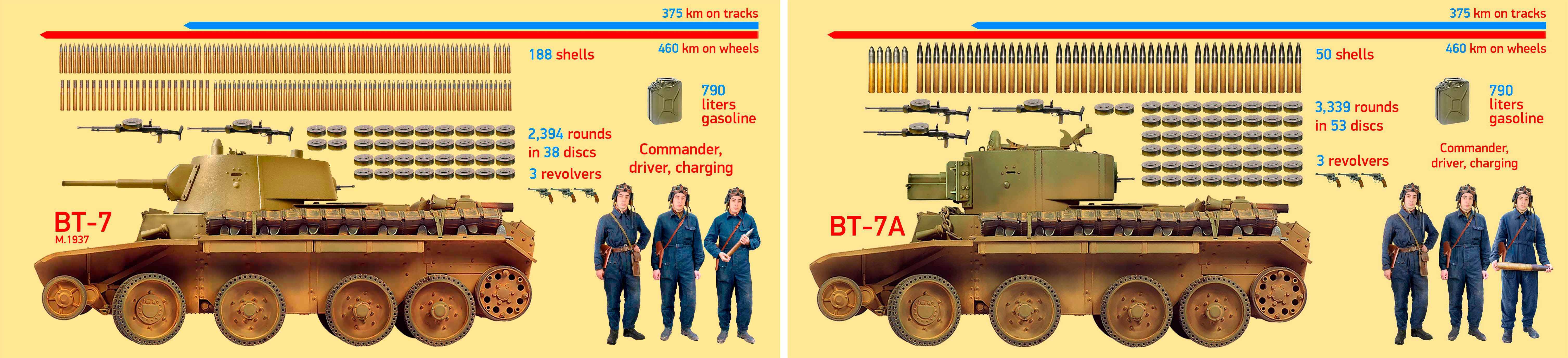 In 1935 and 1936, 1,546 BT-7 tanks were built with the same turret as the BT-5. The command tanks had a radio station, so they had 40 fewer shells.