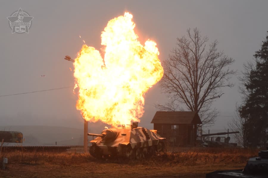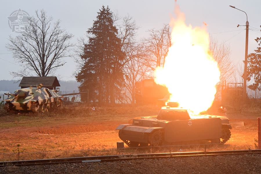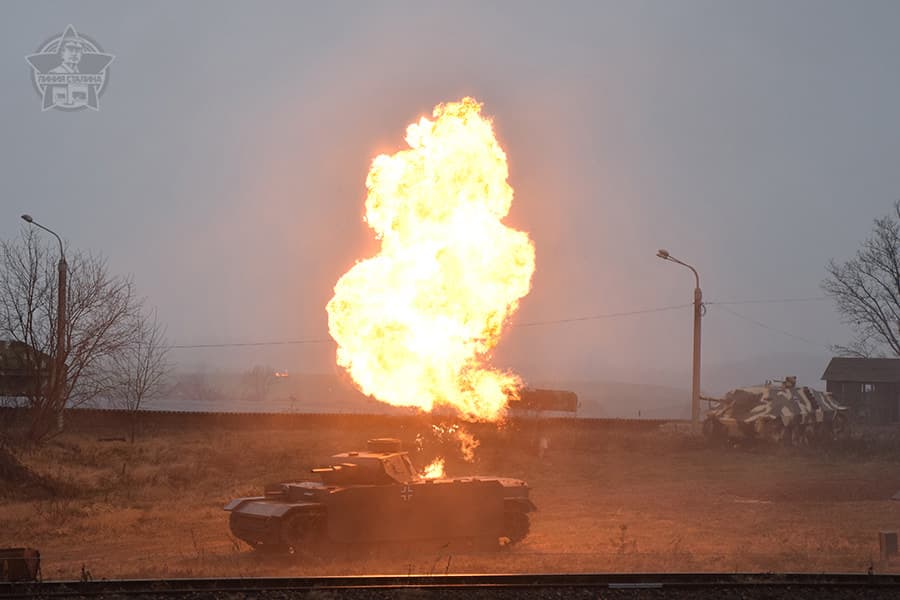 Гости поверх своей одежды надевают советские танковые комбинезоны и шлемофоны, размещаются в башне танка и прибывают к бронепоезду, чтобы начать стрельбу по немецким танкам.
